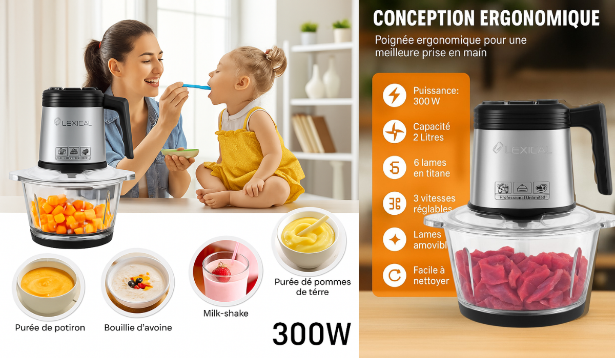 Avec son moteur ⚡ 300W et son grand bol en verre 🥗 de 2 Litres, préparez viandes, légumes, herbes et fruits en toute simplicité 🍅🥕🍏.
