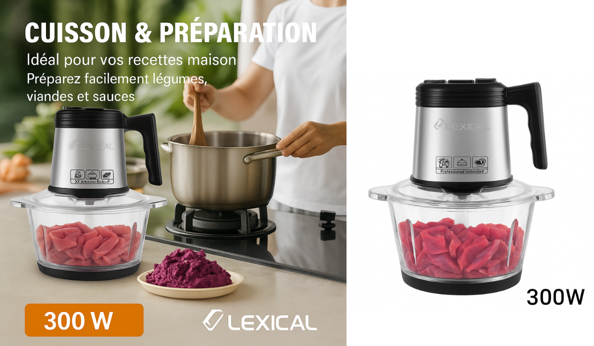 🔪 Hachoir Électrique LEXICAL LCH-1956 :⚡300W de puissance, 🥗 bol en verre 2L & 6 lames en titane ✨. Performance & élégance dans votre cuisine 🍴.
